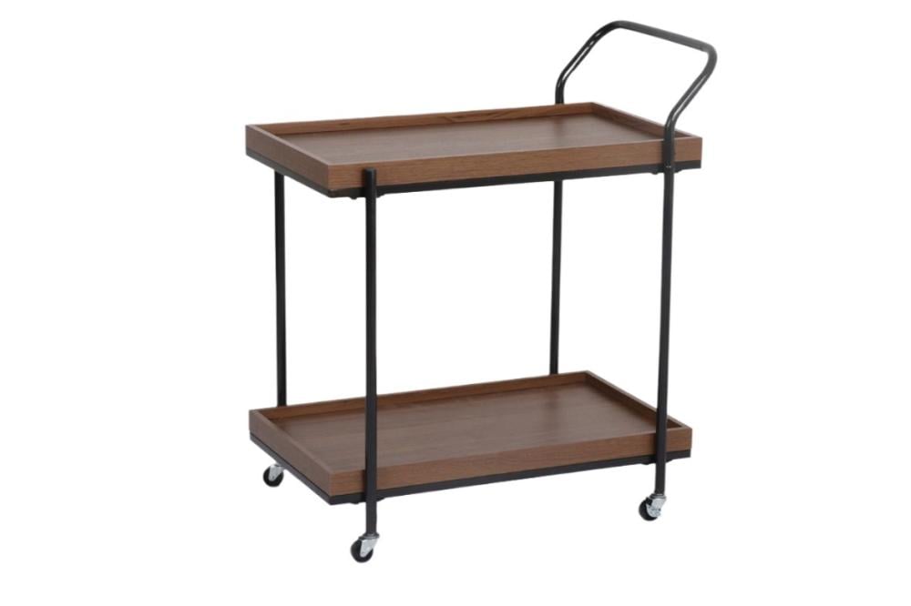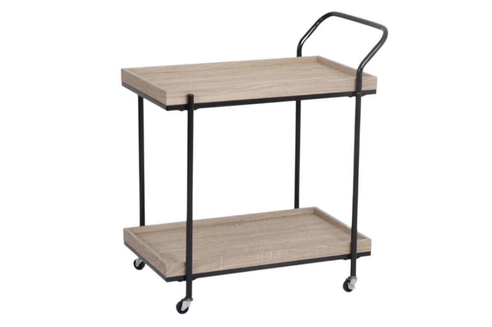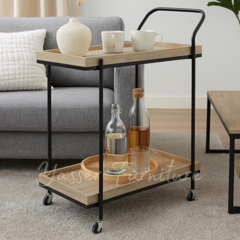 تجمع بين سطحين من الخشب الفاتح والهيكل المعدني الأسود المتين مع عجلات سهلة الحركة.