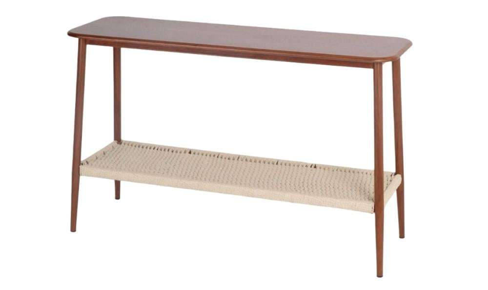 طاولة مدخل أنيقة بسطح خشبي بلون دافئ، مزودة برف سفلي من القماش المنسوج بأسلوب بوهيمي مميز، تجمع بين الجمال الطبيعي والعملية، مثالية لإضافة لمسة ترحيبية وفريدة على مداخل المنازل.