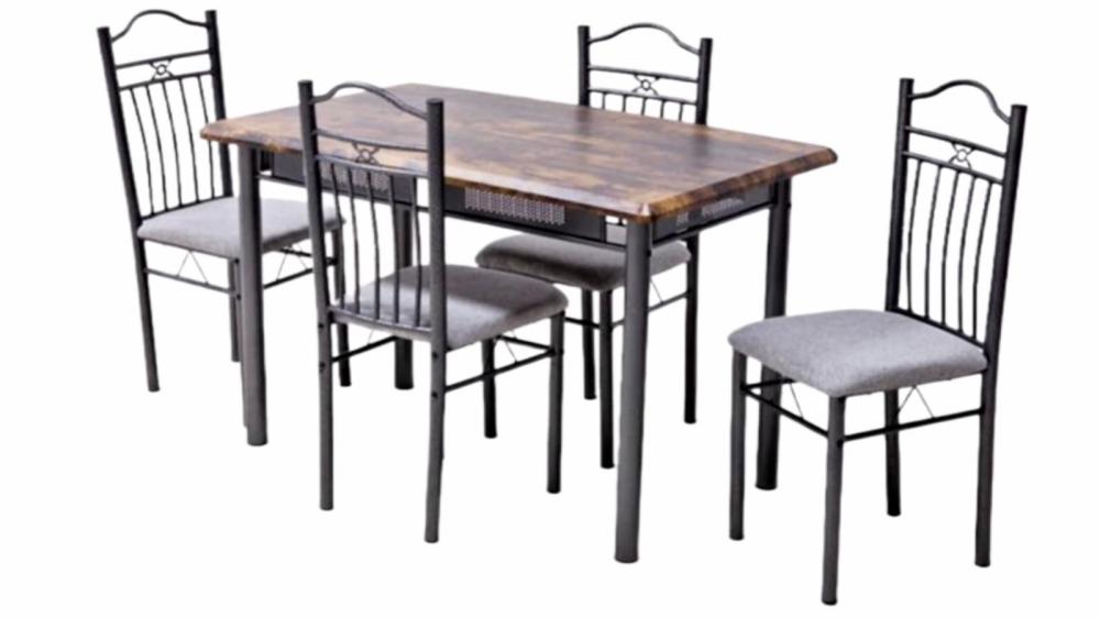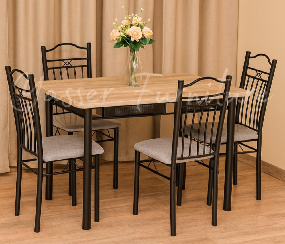 طقم سفرة عملي مكوّن من طاولة و4 كراسي. تأتي الطاولة بسطح خشبي بملمس ناعم يضيف لمسة راقية وسهولة في التنظيف، مدعومة بهيكل معدني قوي. الكراسي خفيفة الوزن وسهلة النقل، بمقاعد قماشية مريحة وظهر معدني مزخرف. متوفر بعدة ألوان،