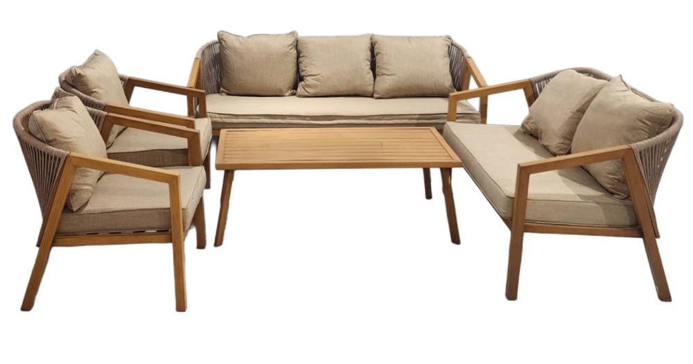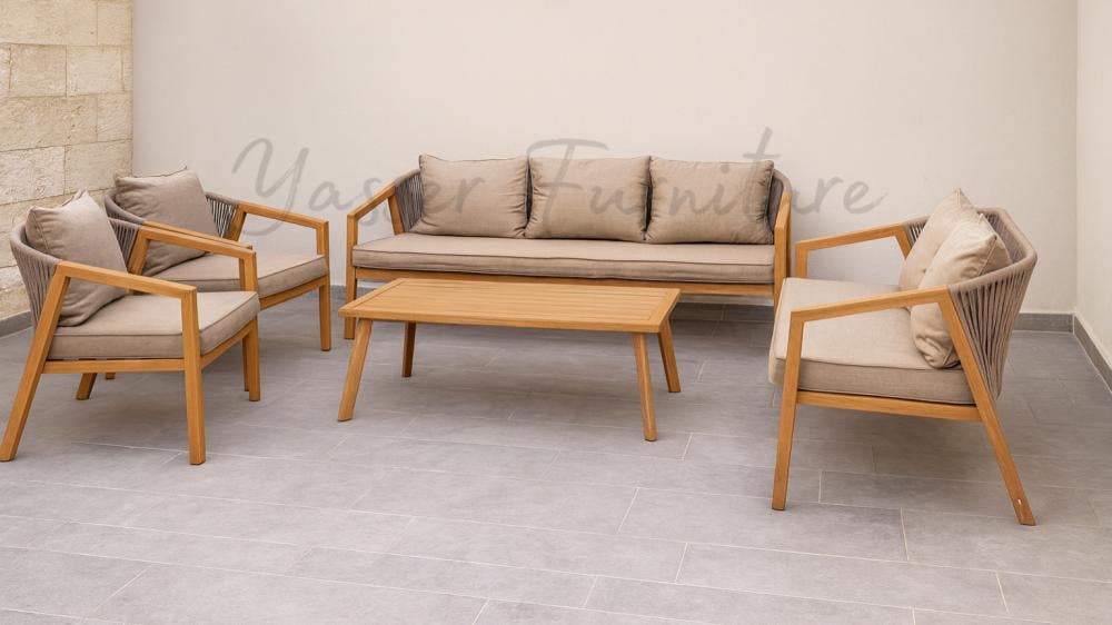 الإطار مصنوع من خشب متين مقاوم للعوامل الخارجية، مع حبال جانبية منسوجة بإتقان تمنح الجلسة طابعًا عصريًا مميزًا، بينما الوسائد السميكة والمريحة توفر تجربة جلوس فاخرة ومريحة لفترات طويلة.