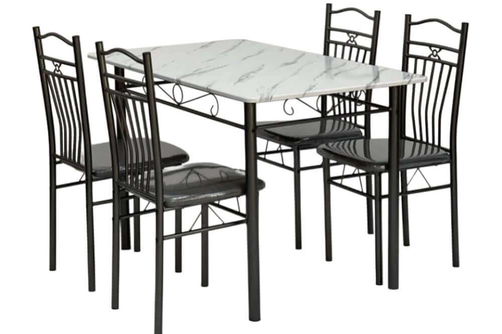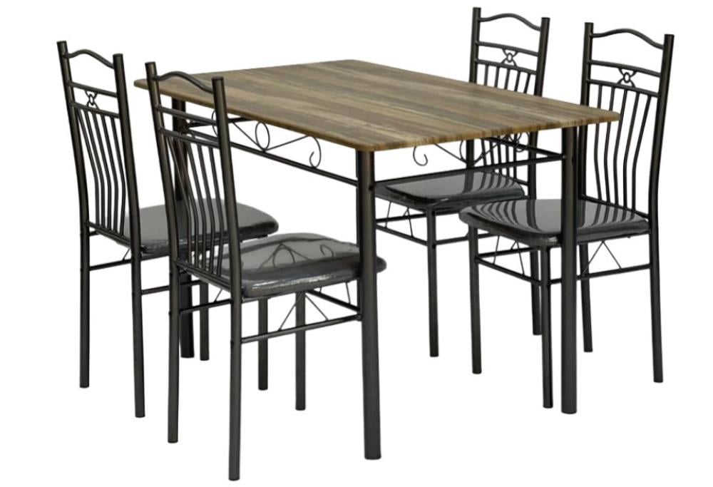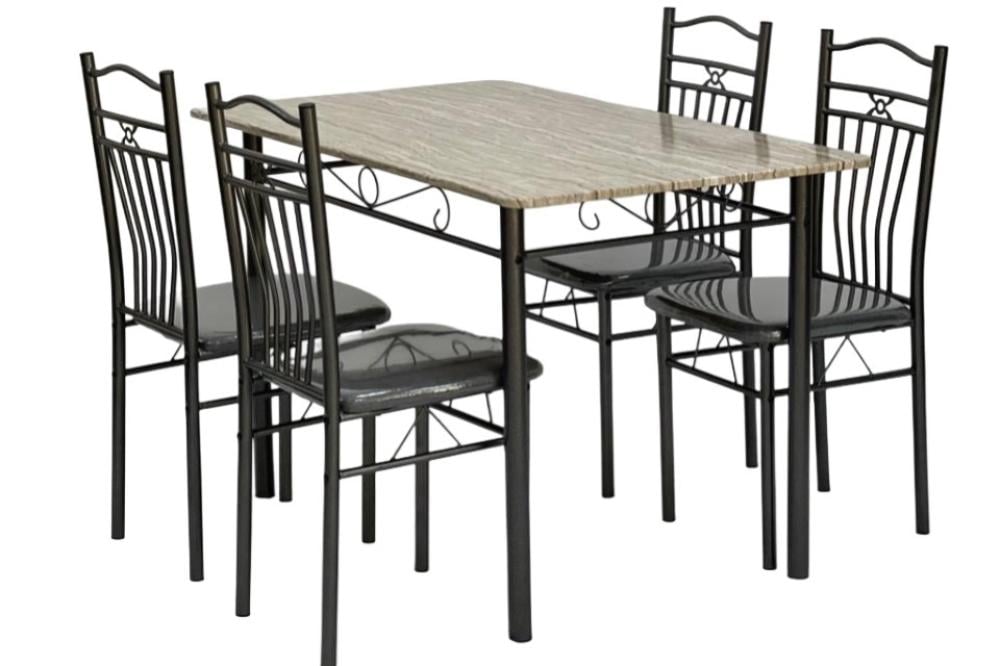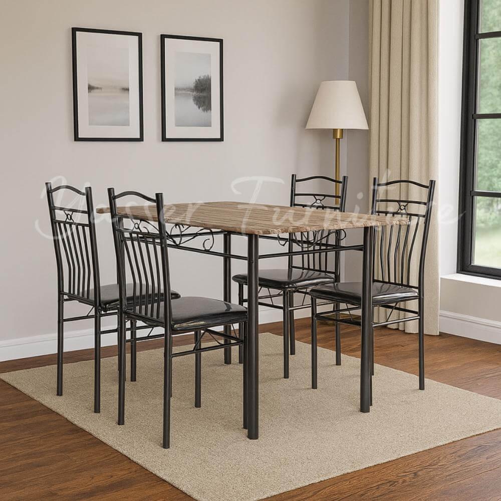 طقم سفرة عملي مكوّن من طاولة و4 كراسي. تأتي الطاولة بسطح خشبي بملمس ناعم يضيف لمسة راقية وسهولة في التنظيف، مدعومة بهيكل معدني قوي. الكراسي خفيفة الوزن وسهلة النقل، بمقاعد قماشية مريحة وظهر معدني مزخرف. متوفر بعدة ألوان،