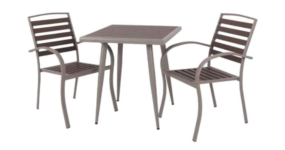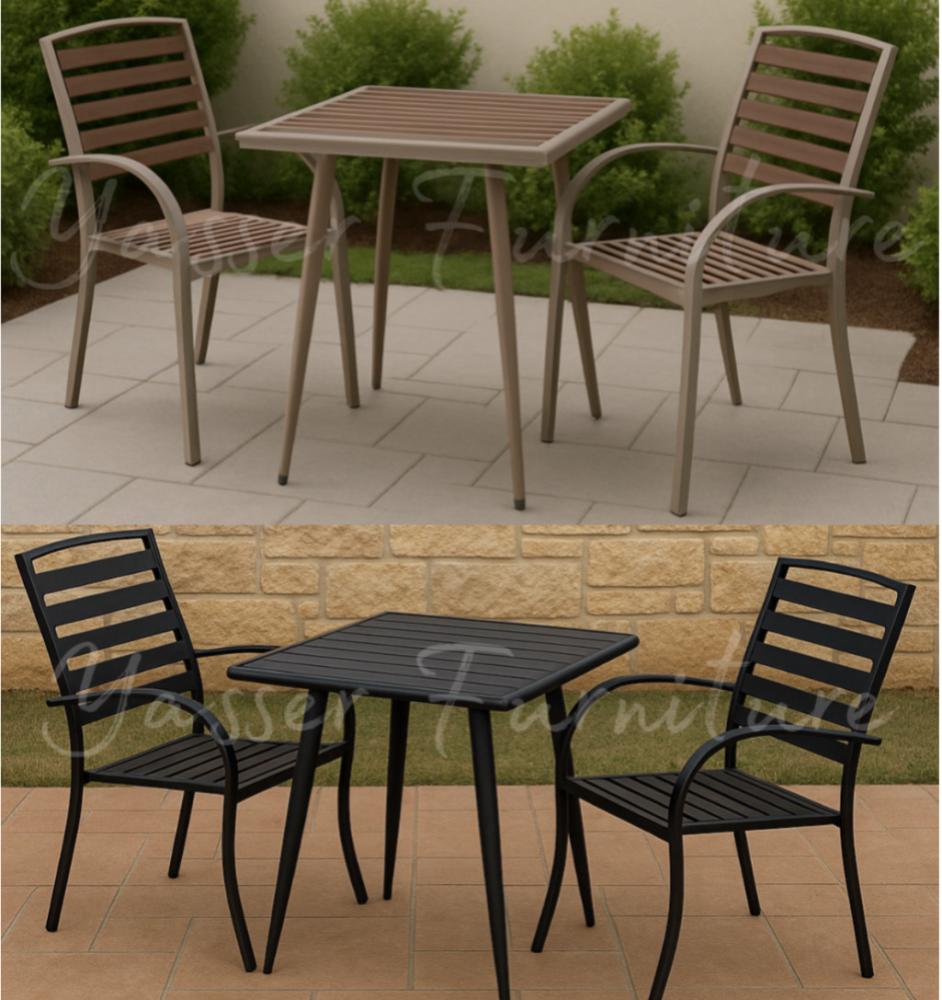 كرسيين وطاولة حديد بسطح وظهر ومقعد خشب، بتصميم خطوط أنيق يجمع بين الثبات والجودة الممتازة، والأكثر مبيعاً متوفرة بعدة ألوان، والطاولة تتوفر بعدة مقاسات وموديلات لتناسب جميع المساحات والاحتياجات.