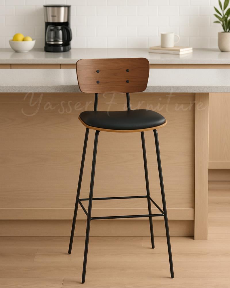 كرسي بار عصري يلفت الأنظار بقواعده الحديدية الصلبة، وظهره الخشبي الأنيق، وتصميم أسفل المقعد من الخشب الفاخر. يمنح أي مطبخ أو ركن بار لمسة فاخرة تجمع بين المتانة والجمال العصري، ليكون خيارك الأمثل للأناقة والراحة.