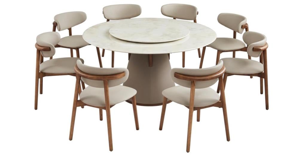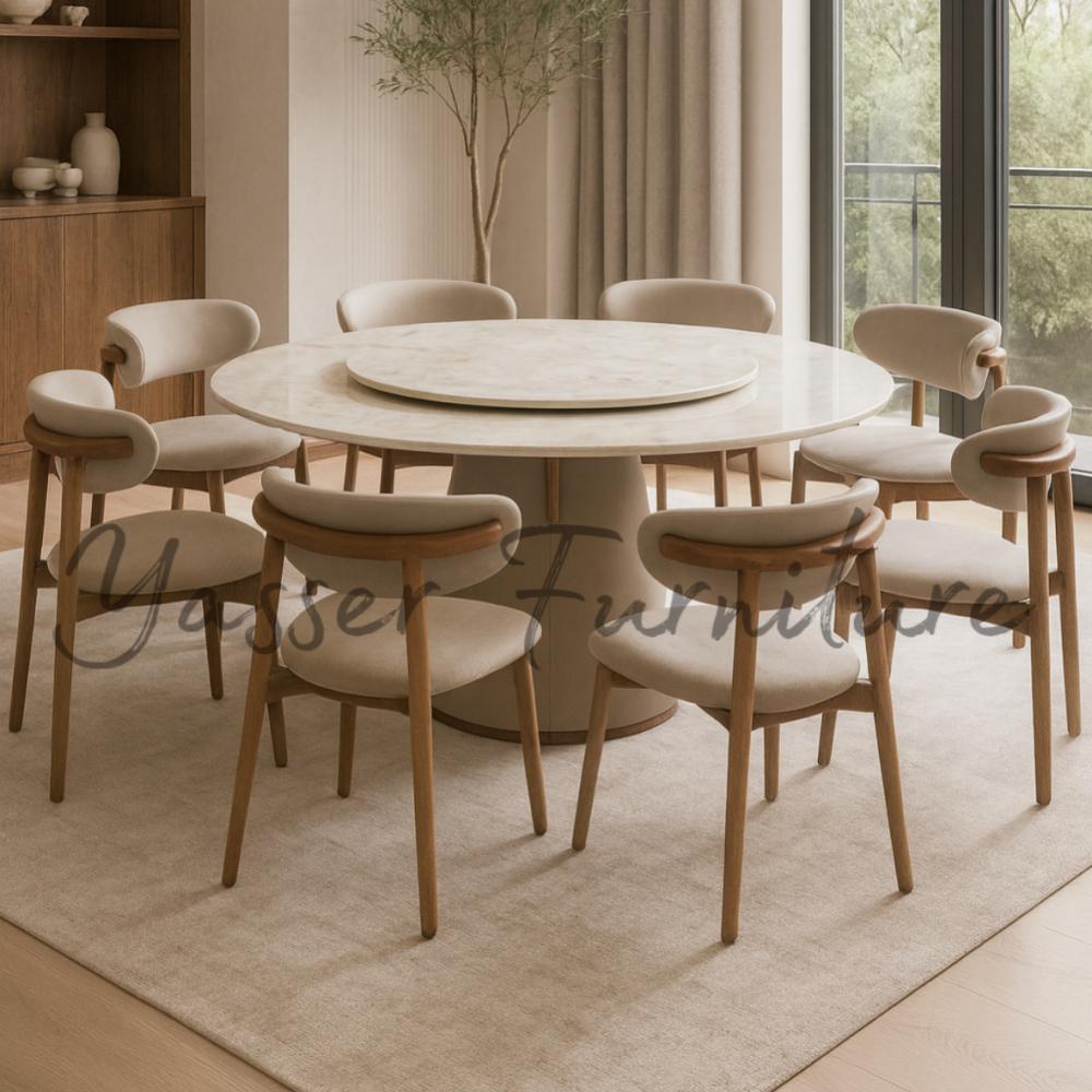طقم سفرة أنيق وعصري مكوّن من طاولة مستديرة بسطح رخامي فاخر يتوسطها دائرة رخامية صغيرة دوّارة لتسهيل تقديم الطعام. الطاولة مرتكزة على قاعدة حديدية متينة مغطاة بقماش جلد يمنحها مظهراً فاخراً وجذاباً.