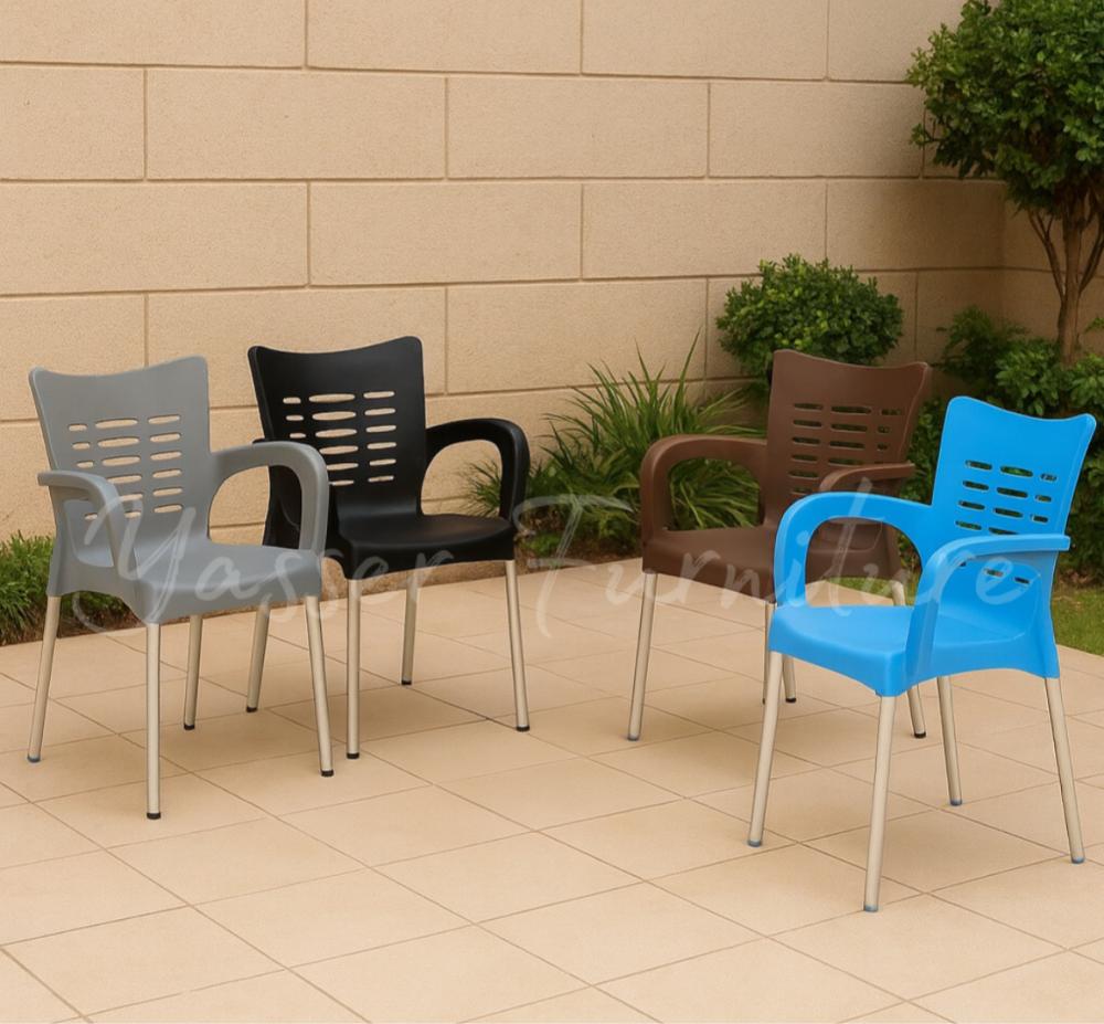 يجمع بين الراحة والمتانة بفضل تصميمه المريح ومساند اليدين القوية، مع أرجل معدنية مقاومة للصدأ تمنحه ثباتاً يدوم طويلاً.