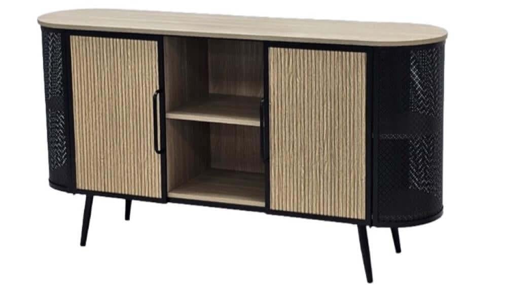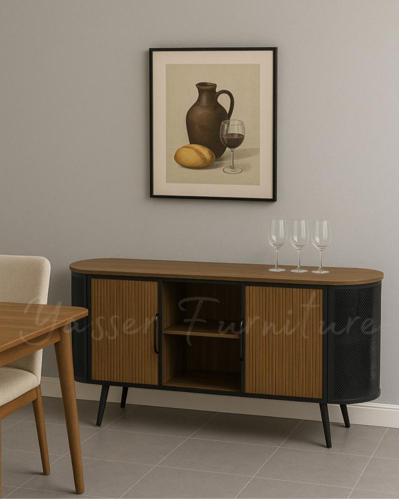 دولاب بوفيه خشب مقاس 160 سم، مزين بشبك حديد أنيق يزيّن الأطراف ويمنح التصميم لمسة جمالية عصرية يتميز بقواعد حديد قوية تمنح الثبات والمتانة، إضافة إلى أدراج داخلية متنوعة لتنظيم أفضل. متوفر بعدة ألوان ليتناسب مع مختلف الأذواق والديكورات. خيار مثالي لجلسات الطعام أو مساحات الضيافة.